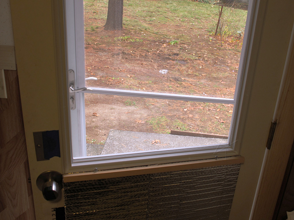 | More toward the late-middle of October I set house projects aside long enough to handle my part of our local haunt event and tried to get this writeup a little more organized in between, but soon found myself glancing back at the to-do list and picking some of the minor things to tidy up. One of which was to get some urethane on the fairly raw-wood-feeling edge of the new side door, now that I had the storm up which could keep bugs or chilly air out in the meantime. Without really thinking about it I completely picked the *wrong* day to tackle this. |