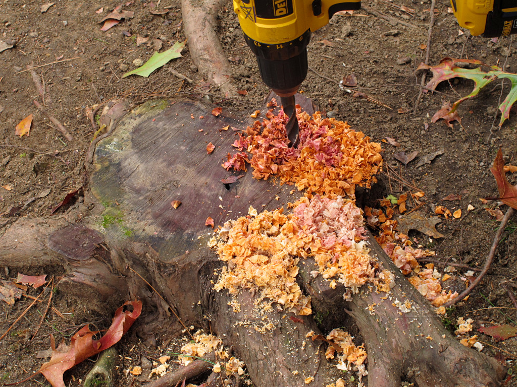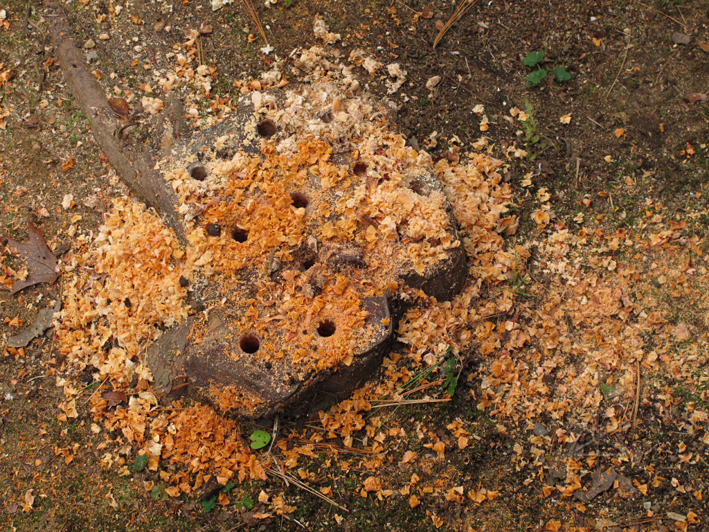 When I started drilling, a whole variety of different vividly colored wood shavings came out depending on where I was in the trunk cross-section. |
