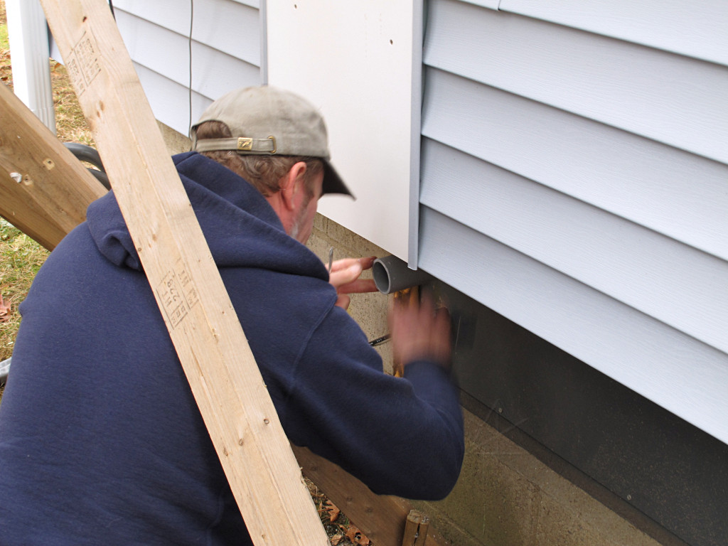 I showed them a print of my picture of the strapping behind the Azek panel and marked where the "meat" was or wasn't along the top edge, warning them that it might be a little fiddly to match up the holes in the rear of the box with the most solid layers and to use nothing longer than 2" screws for optimal penetration depth. They didn't seem too concerned that attachment security would be any real problem and the main limiting factor on position was needing to have the knockout right over the LB, but I think they got it on pretty solidly without wrecking my pipe seal in the process. |