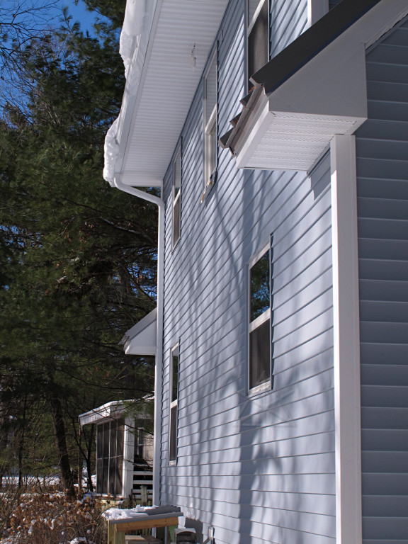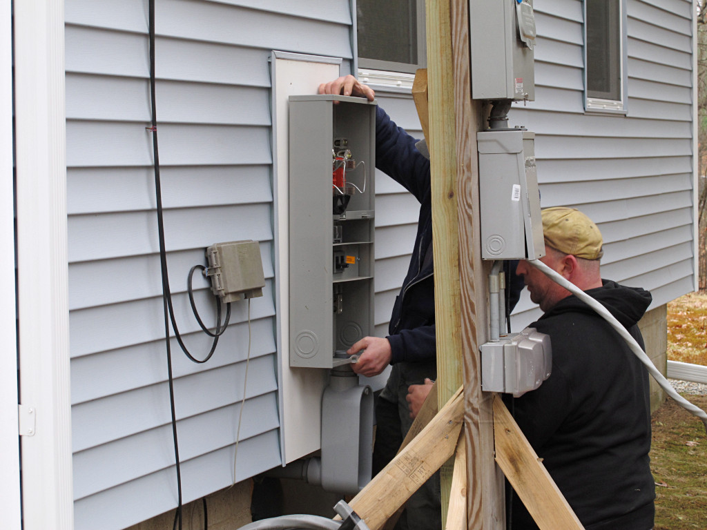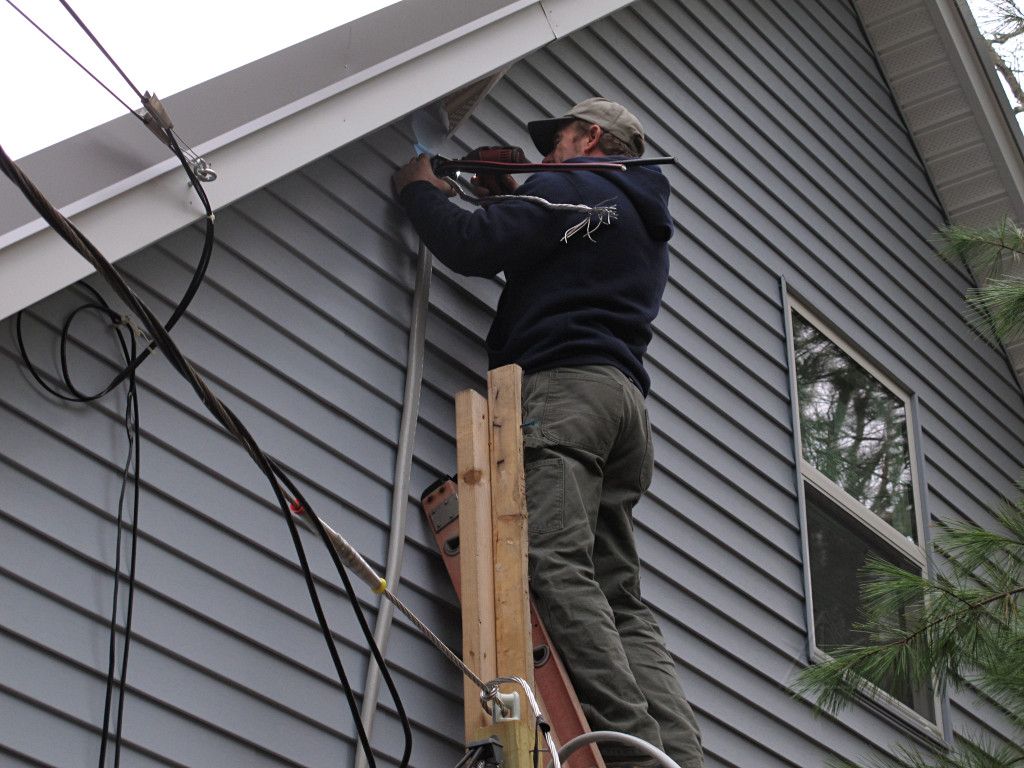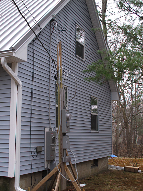 In the meantime we'd had some discussion about job specifics -- the typical spec for a 200A residential feed meant a pretty fat cable coming in, and I suggested that perhaps using copper instead aluminum service-entrance wire might make it a little thinner and easier to work with... right? Not so, it turns out; SE cable might be a smaller gauge for the same ampacity but with relatively few strands is actually *stiffer* than aluminum. Anyway, we finally arrived at a day when his guys could come out and finish this up, even if they couldn't schedule the power-company linemen to put in the new street drop at the same time. In other words, continue from where they left off way back in part 04! They could get everything else ready and restore power, again temporarily, until the final house reattachment could be done. |