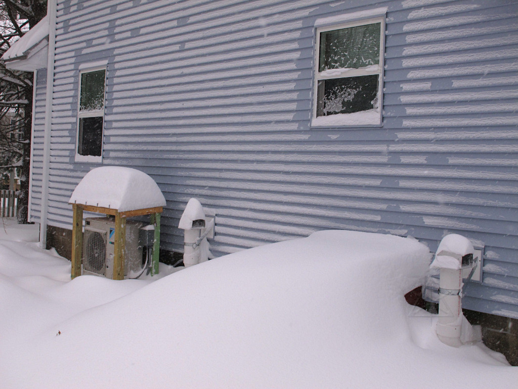 The heat pump started up a little later, and out the window from above the hutch I could see the colder-than-ambient blast of air going out across the lawn. It's nice that the waste air gets sent directly *away* from the house, rather than washing up against the wall like would partially happen with an upflow unit. |