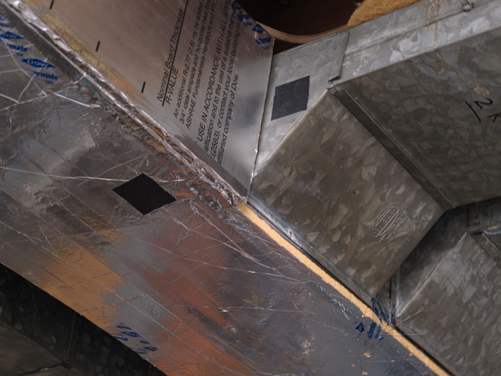 I'd use foil tape to close the joints, but the first few internal support points needed to *not* be thermal bridges to the ducts themselves. I had a small amount of the mega-sticky Weathermate tape left over, which would be perfect for the first attachments to keep the stuff in place because the foam pieces basically weigh nothing anyway. |