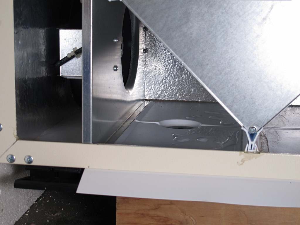 And perhaps that point would be sooner rather than later, as internal condensation wasn't the only hygrometric game going on with the HRV. While waving the IR-cam around the basement I spotted a very cold area right around the intake duct which I thought should be a little better contained, and upon investigating more closely found that the whole area was wet. |