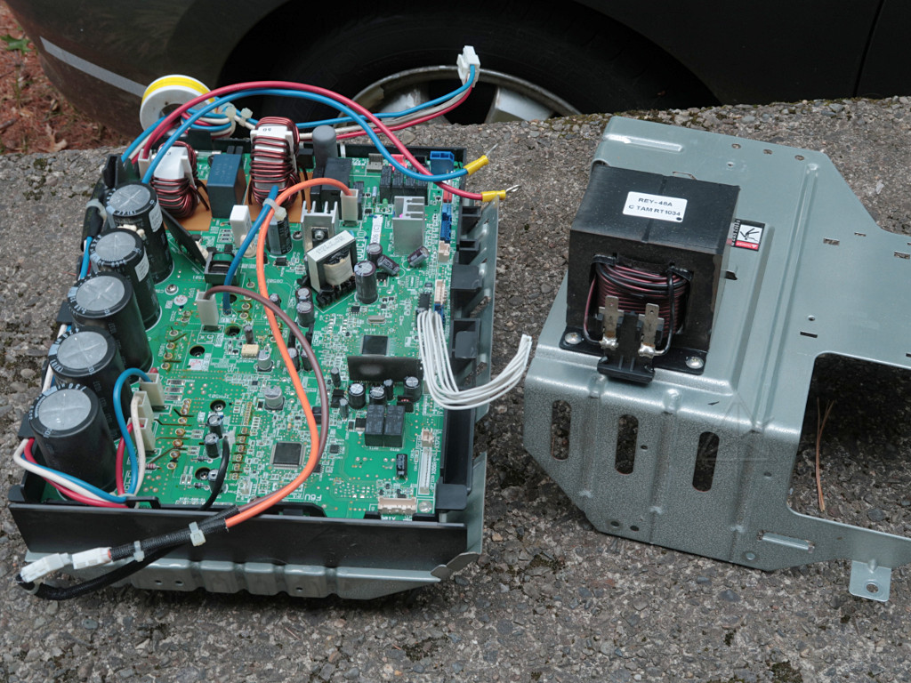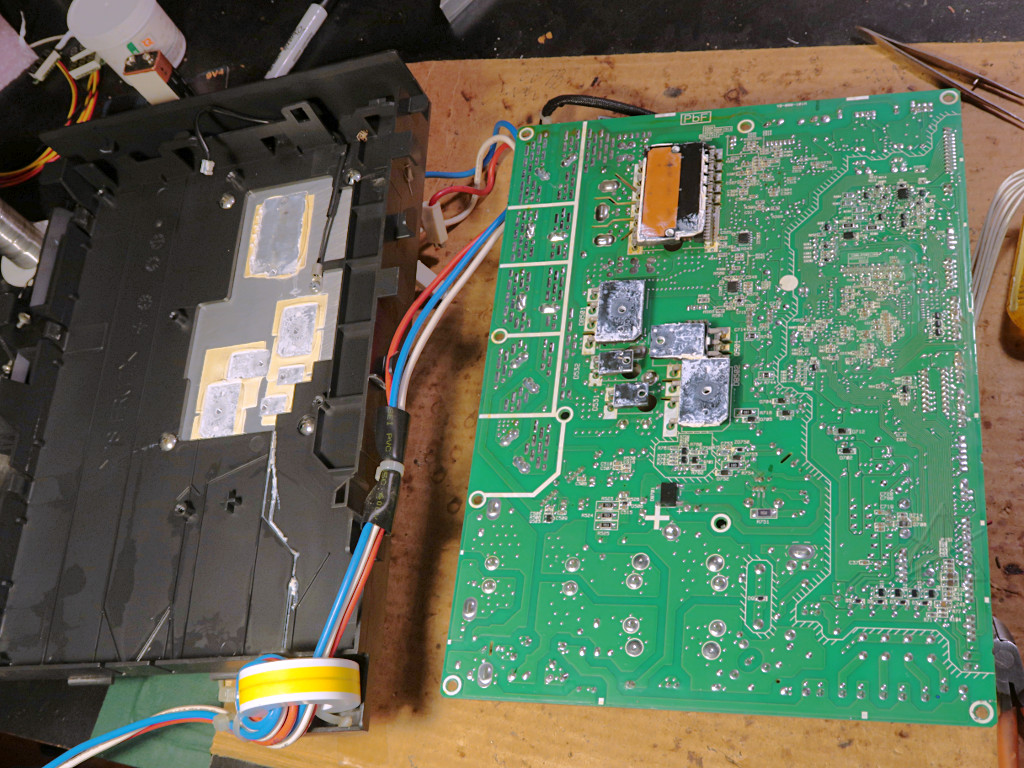 | We can't see it here, but there's a largish finned heatsink sticking out the back side of the board assembly, that sits in the airflow from the main fan. No power devices are visible on the top side of the board, but it is pretty clear from the large lands and isolation gaps where they are soldered in from the flip side. |