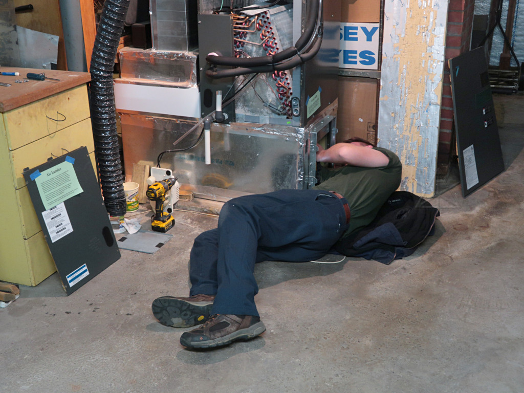 I pointed out that I'd installed the plenum access hatch for a reason, so he did due-diligence probing all around the underside as far as he could reach. Still nothing. |