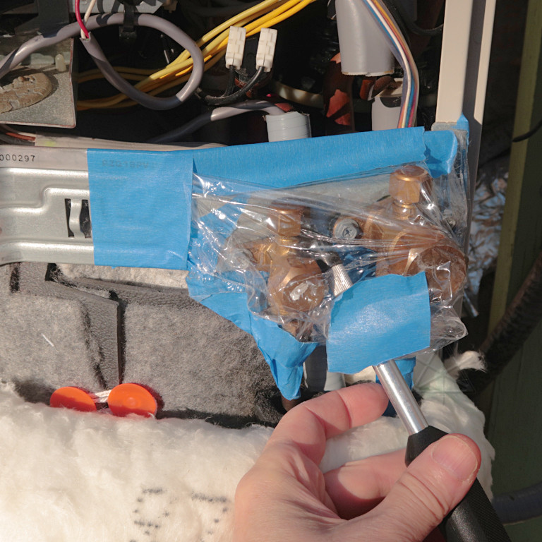 So the next thing was to finish studying up and schedule my 608 test. This process was rather fascinating, because there was a lot I didn't know about other types of refrigeration systems and correct handling of their contents. Industrial low-pressure chillers using R-123 or old R-11, for example, run at both above and below atmospheric pressure, and invariably suck in a little bit of ambient air -- and have special "purge units" to collect and eject it automatically! I learned what those little dead-end copper tubing stubs sticking out of small refrigerator compressors and such are for. I delved further into what recovery machines can and can't do. There are all kinds of arbitrary facts on what year certain restrictions kicked in, and how much negative pressure a given size system needs to be recovered to, and even how much a responsible technician or company can be fined per incident of illegal venting to the atmosphere. Much of it is interesting science; some was just arbitrary cramming that I've already forgotten but could easily look up in the material I collected. And all of my study material came for free with a little google-fu. Taking the test was a bit of a saga, leading to one total fail for completely unrelated reasons at the company my buddy had recommended, and then a successful test session at their competition. And I *aced* the test, only two wrong out of 100, handily earning my "Universal" certification to work on all four types of equipment. The same shop where I took the test accepted the temporary PDF printout of what my card would look like when I went back the next week, and I drove triumphantly home with a new pink jug of R410A and gave my system the three additional pounds of juice that it had been craving. Now I could at least cater to its drinking problem without outside help, while continuing to chase the leak conundrum. As more time went by it was clear that the leak was still present, albeit a little slower than after my buddy had taken his stab at it, so there was some maddeningly variable factor still in play. Even armed with a better sniffer by now, I was still basically getting nothing on my leak-hunting efforts. I got a few one-off sporadic readings around parts of the indoor coil, and couldn't quite determine if the UV light spotted a tiny hint of bright green?? buried deep in one section of the finning. Probing the indoor coil is easier since the air around it can be made absolutely still, and refrigerant tends to drift downward in air. But those hints weren't consistent, just like for the first tech who visited this thing when the problem first began. The primary suspects were still elsewhere, however, and one of the purchase cycles from Amazon included the gear necessary to change out the access-port Schrader cores. The guys responding to my thread at HVAC-Talk agreed that in a system eight or nine years old, the original valve cores could easily be suspect. |