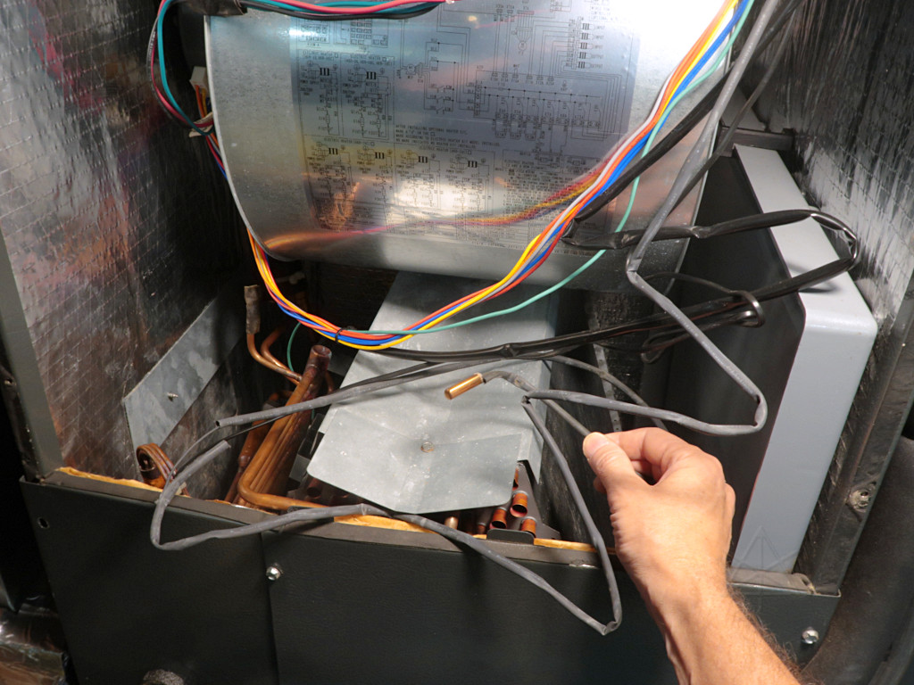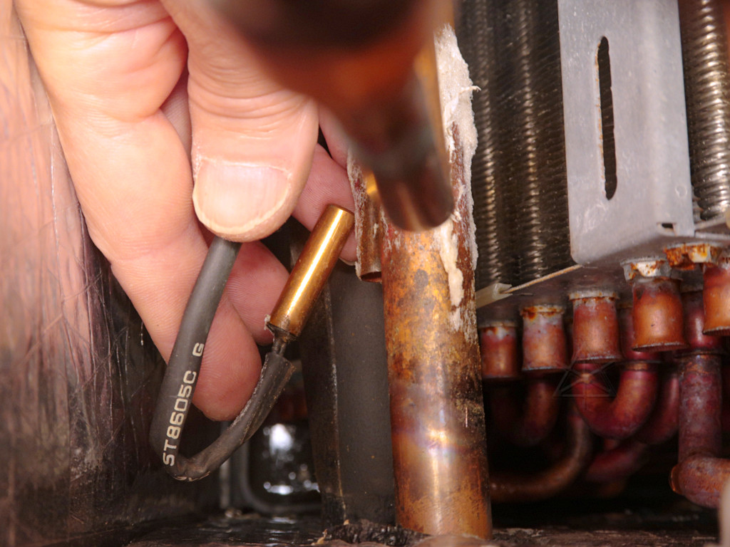 It took a bit of tight-space work to cut loose the foam and glue around this thing, but eventually it was all exposed. The thermistor pod goes into a custom-fit boss that's brazed right onto the pipe, ensuring the best possible thermal contact and the sensor sitting at the correct angle around the pipe, the same as where a traditional TXV bulb would clamp right at the "sweet spot" gas-above-liquid level. A small spring clip inserted along with it keeps the thermistor module pressed evenly toward the pipe itself. |