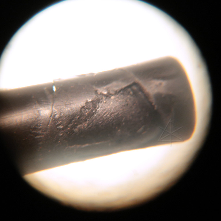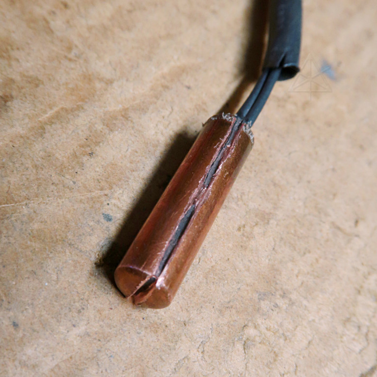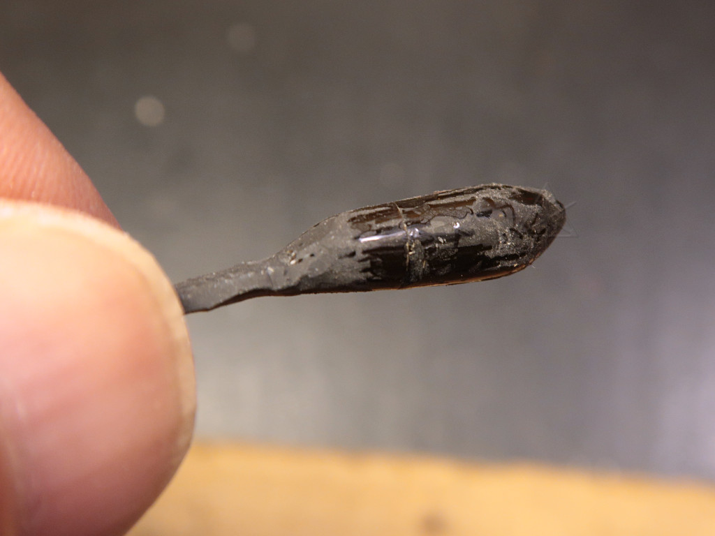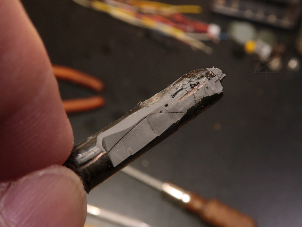 Finally I was down to the little thermistor "torpedo" and whatever remained around the wires. Now I could see a substantial crack in the thermistor envelope itself. This thing was a real mess. |