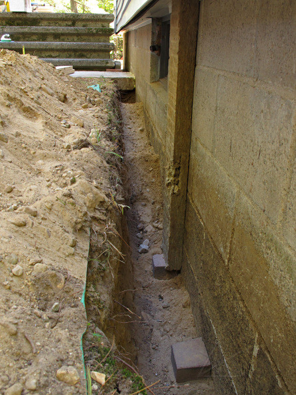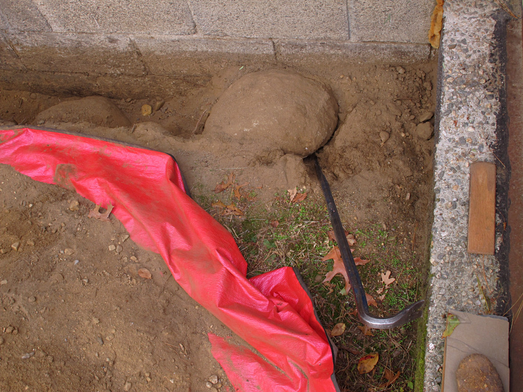 The Mighty Homebuilt Dirt-Tamper of Doom emerged once again, and was the perfect width to get down into these trenches to compact the backfill. I did this in incremental layers, to ensure best uniform density all the way up, and managed to not ding up the face of the Roxul too much with mis-aimed hits. This might have been the only part that would have annoyed the neighbors, as the soil hereabouts is fairly resonant when impacted. Thump, thump, thump, thump thump ... thump, thump. Thump, thump, thump thump thump thump thump thump ... thump, thump ... |