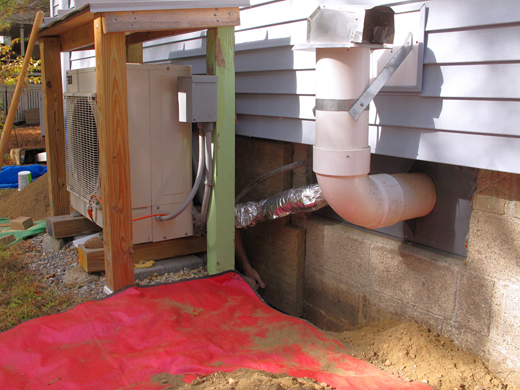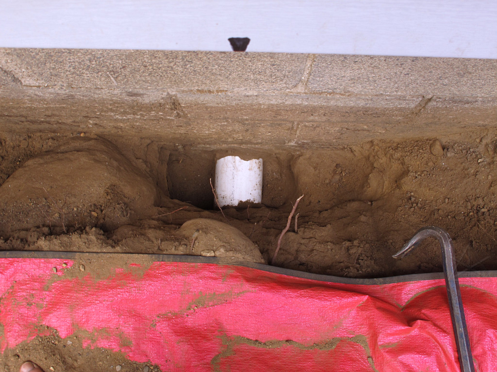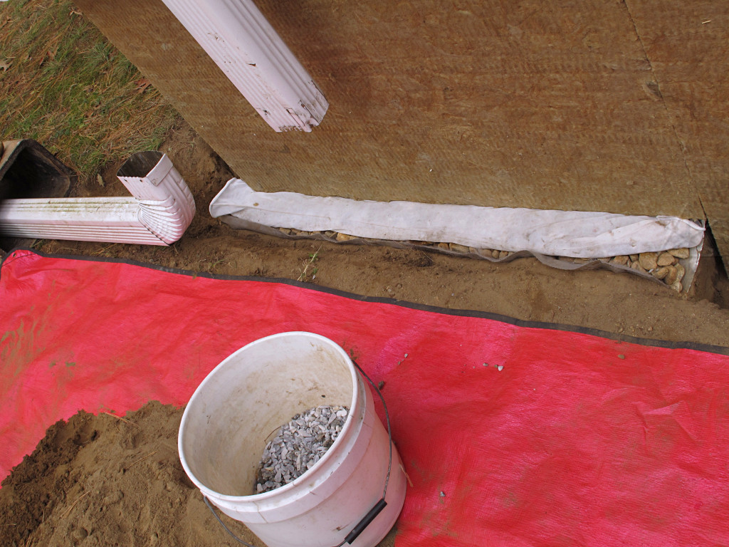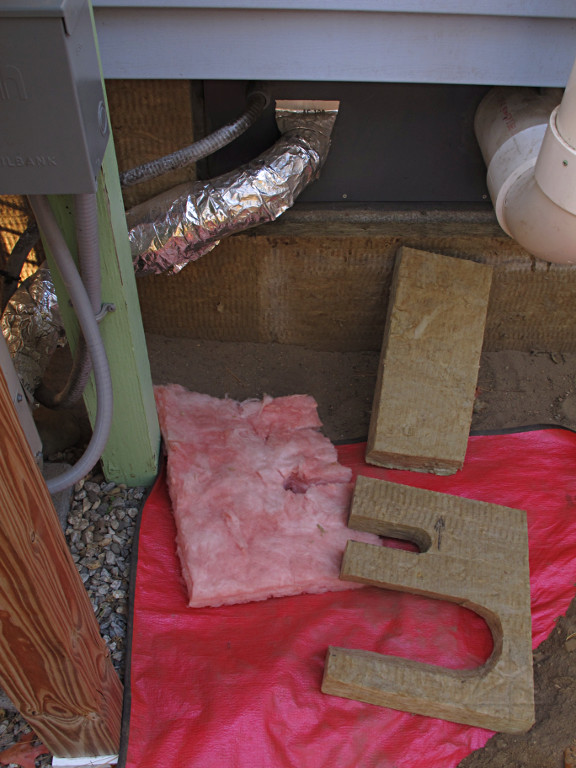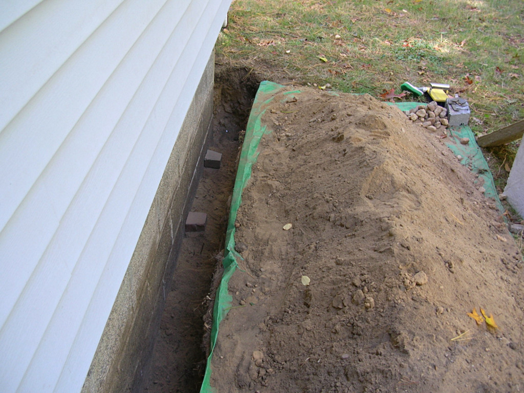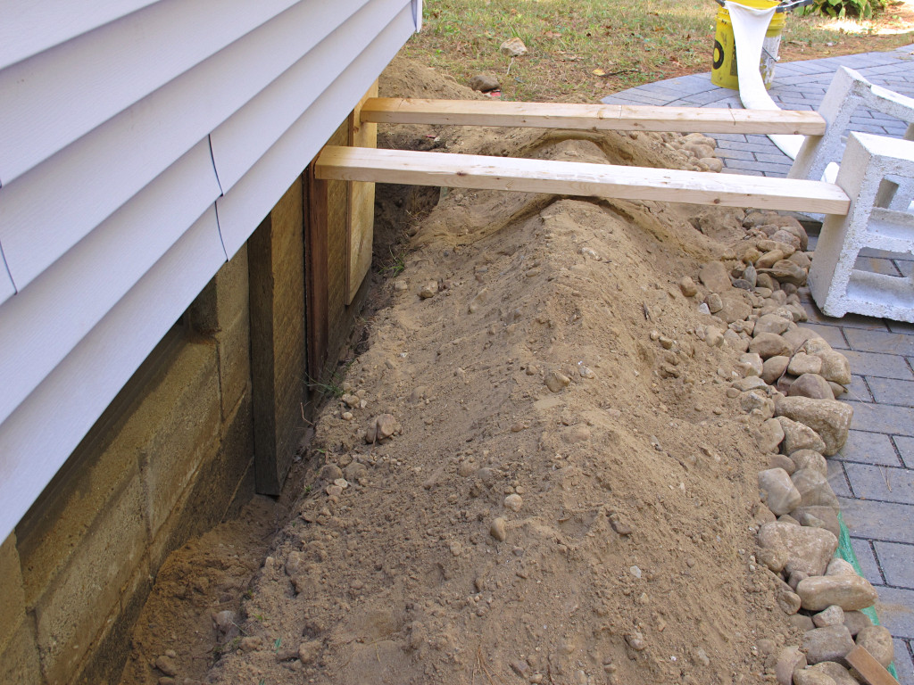 A couple of months later, the first winter for this experiment was fairly mild in general but did bring a week of single and subzero digits -- nothing like the ice dam festival from the previous year, but still a good solid run of frigid. The soft dirt around the walls did a rather weird frost-heaving pattern, fluffing up about an inch above its packed-down level and working open a gap away from the Roxul surface. The soil right next to the house had always done that to a small extent, but now with the exterior of the wall so much colder there was nothing to warm that dirt up any more so any moisture trapped in it received the full influence of ice crystal expansion, trying to build its own little pingo. |