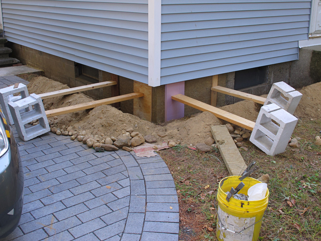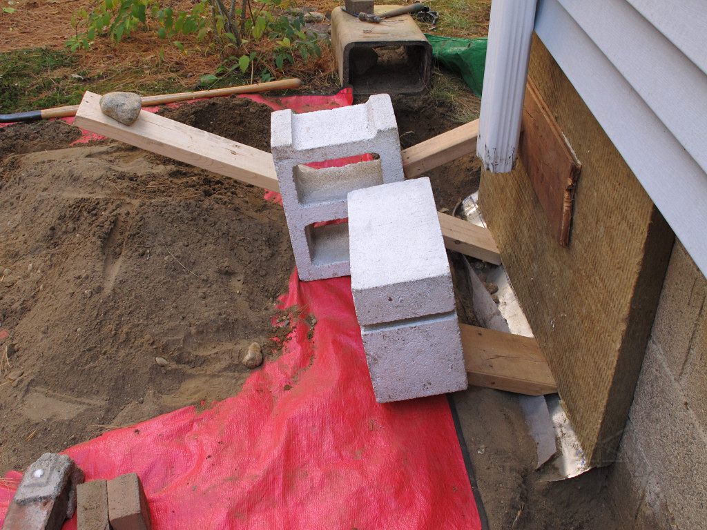 With a little struggling I got my first piece on, and braced it with inward pressure to cure the adhesive. In most cases, holding pressure was obtained by simply tilting one of my brilliant white cinderblocks up slightly with its back corner retained by friction, and sending that force compressively through some member of an appropriate length to reach the wall where pressure was then spread out across the adhesion points on the insulation piece. In other words, any temporary crock-up of weight and pieces of wood that would work to push the panel against the wall -- and slightly upward if possible. I also reached down and squidged a little more dirt in under the bricks to increase their upward force before leaving everything alone to set. |
