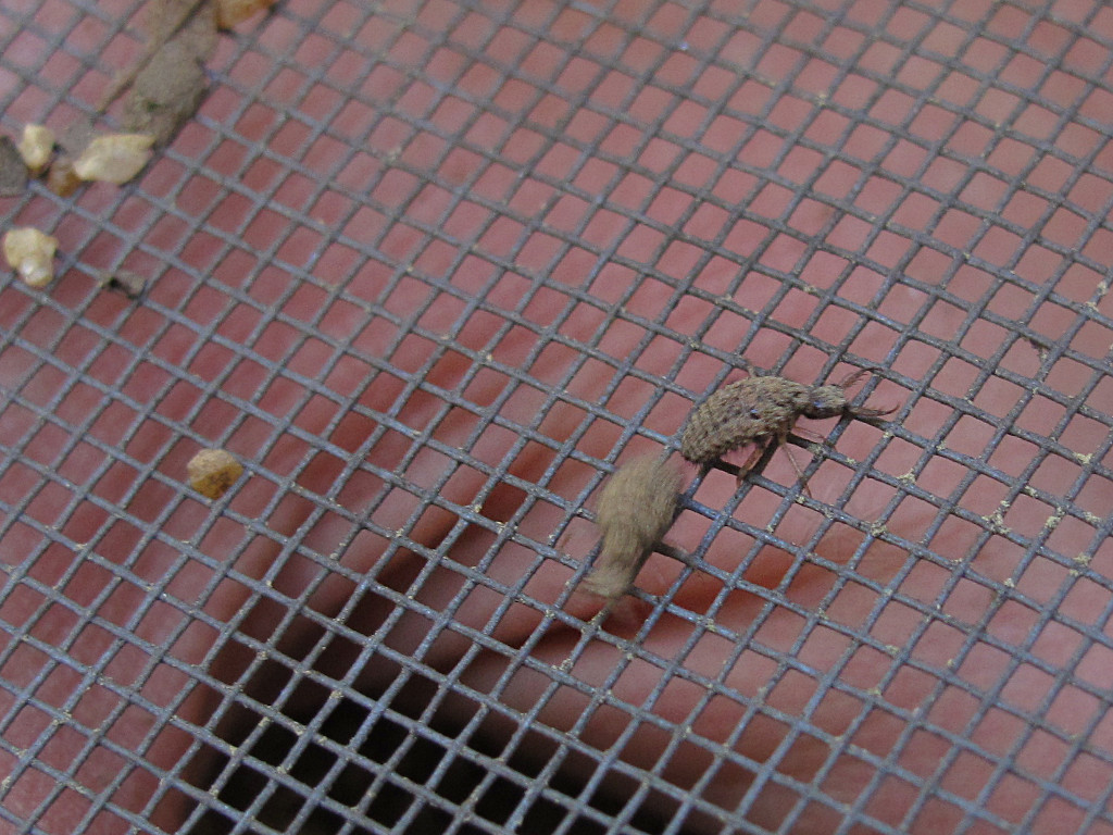 My helper, a biologist/naturalist by trade and avocation, had noticed several small conical pits in the very dry soil next to the wall and thought they might have been made by ant lions. We both found this odd, thinking that ant lions are more a southern thing, but we dug up a little dirt around some pits and managed to isolate the critters onto a piece of window screen and sure enough, that's what they were. These are actually ant lion larvae, also called doodlebugs. The adults have wings and look more like small damsel-flies living above ground, but the typical notion we have from guidebook pictures of ant lions is of these terrifying monsters with huge pincers that pop up out of the ground to grab their prey like the sandworms from Dune or Jedi. In fact they're quite small, and move mostly backwards with an odd humpy jerking motion that helps them dig and form the trap pits. |