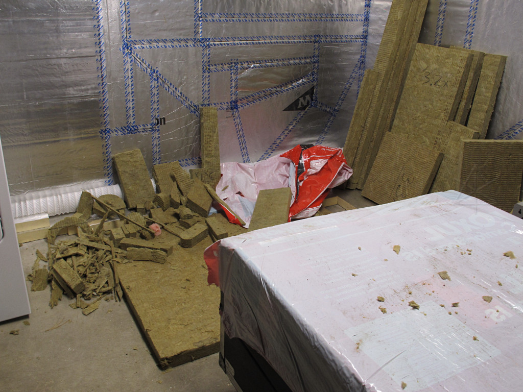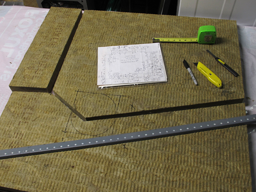 At this point I had an impressive pile of cuttings, plain and fancy. Adapting to the various features usually involved measuring outside and then cutting inside here, and I was glad that all worked out without any major foul-ups to cause material waste. The roadcases for my 918s had gotten commandeered and lashed together against a lally column as my cutting table, covered with one of the Roxul wrappers. This entire corner was a festival of fiberglass shards by now, and cleanup after everything was done took a while. |