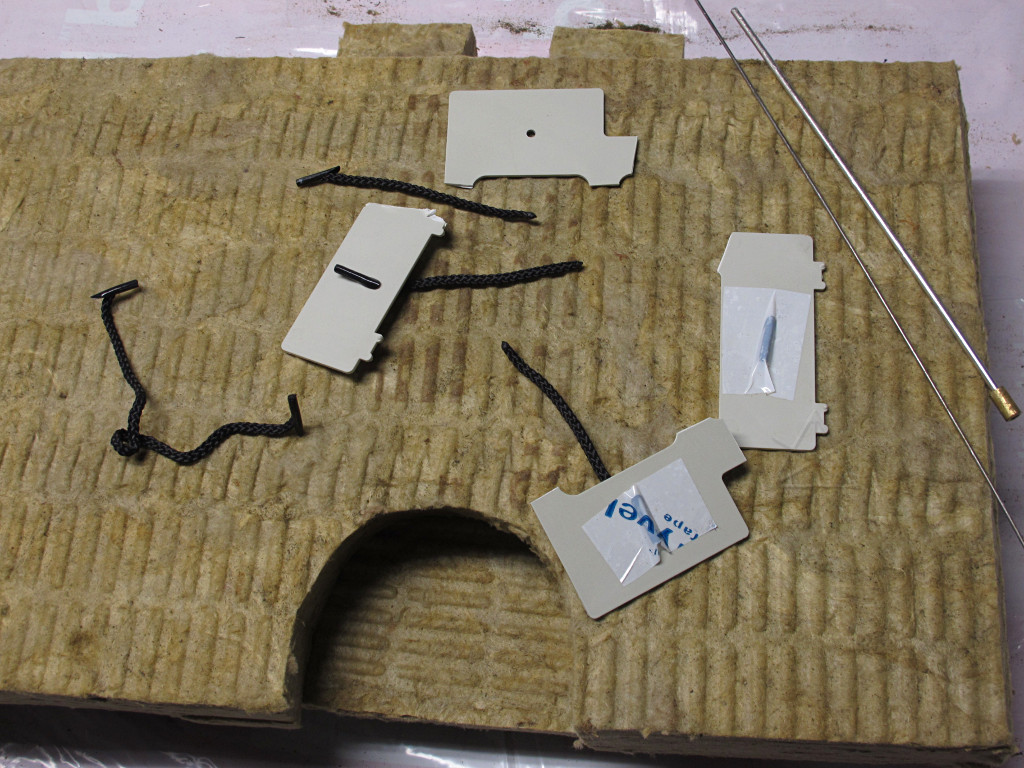 Because any removeable sections would fit back in rather tightly, I needed a reliable way to be *able* to remove them again, however infrequently, without mangling the insert pieces all to crap with external tools. A couple of screws through from the back of the small test-patch piece with washers on the backside had sufficed for that instance, but I didn't really want rigid screw points sticking out of the wall here and there being physical hazards not to mention unnecessary thermal bridges. Instead, small lengths of nylon string were turned into pull handles connected to load-spreading anchors on the back. The strings were separated halves of the otherwise mostly useless poi-leash bridles that had come with the glow balls I had ordered, and already had convenient little tee-shaped anchors attached, which could then go through little flat bits of plastic and get taped in. Close-fitting holes were then punched through the Roxul piece to tease the strings through and the whole assembly tacked down with adhesive from the back, and there were my pull handles. |