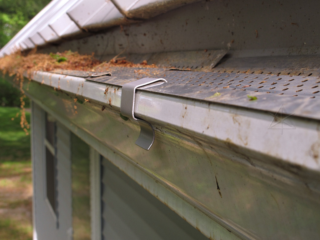 | The perforated metal leaf-guards that got installed with the gutters originally got zip-screwed into place at the outer lip of the K-section, and while the guards seem to work reasonably well there is not a gutter-screen product made that will never have to be opened up at some point for cleanout underneath. With trees overhead and seasonal pollen and dust flying around, fine organic muck will simply accumulate no matter what the design tries to take into account. After realizing that a year and a half in there was already a bit of muck buildup on the bottom of the gutters, I needed to get in there to check on things and maybe give everything a quick cleanout. Rather than have to mess with a bunch of [steel, thus galvanically mismatched] sheet-metal screws and trying to re-thread old holes every time I went to pull the guards, I wanted to see if some sort of quick-release retaining clips could be fitted instead. |
