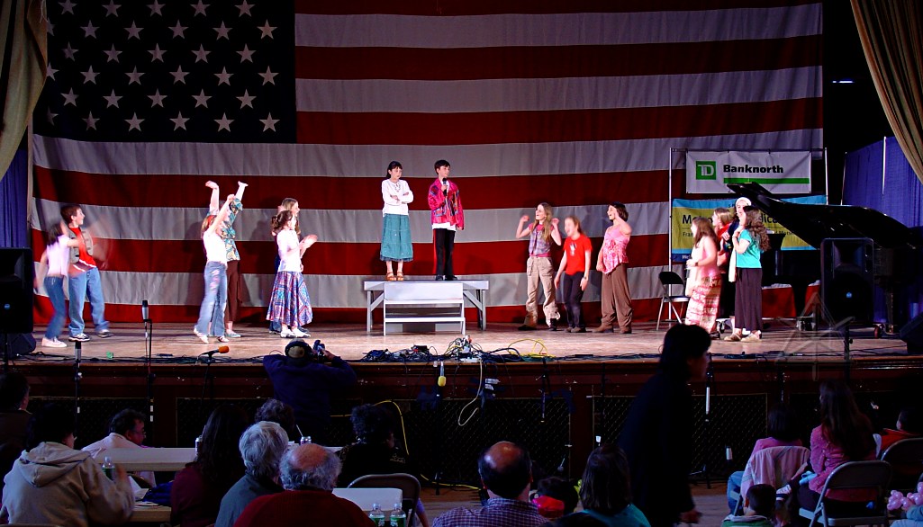 The next act on stage was a men's chorus, doing various patriotic songs. They were very, very red, even before the lights hit them.