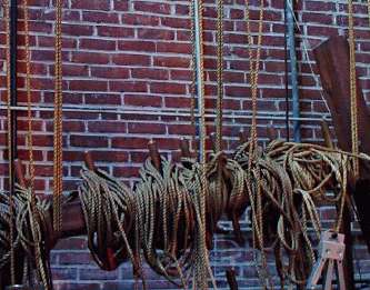 Maintenance isn't something that gets funding here. This is what I called the "shipwreck" -- it's what's left of the pin-rail for the old fly system, and upward pull has apparently long since broken it loose from its mountings in the floor. Various random parts of this nightmare are chained down [here] or up [overhead] to try and prevent any further movement. But it's all very scary, there's a bunch of furniture piled up around it, and nobody appears to have dared touch any of it for years.