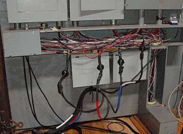 And the other really scary thing -- what passes for a "tie-in" is short bare ends sticking out of those big globs of tape, that I had to then barrel-connect the dimmer tails onto. [One of said barrel connectors is sitting just under the leftmost breaker box, but that's the horked one I found and removed while swapping mine in.] All of this is just hanging out of the open raceway, the sharp metal edge of which has started cutting into the insulation. I found a few pieces of cardboard under the rats nest, presumably from previous efforts to prevent abrasion, and *taped* it in place under the big wires. No, there's no disconnect -- no way to turn any of this off, so I had to do the whole thing hot.