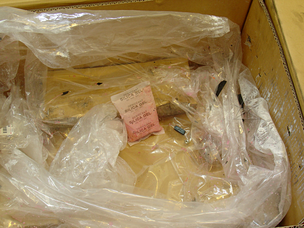 There is white heat-sink goop and pink antifreeze everywhere, of course, because one can never get one of these things totally empty. Blech. The package of "do not eat" appears to have soaked up a lot of the leakage. The presence of various bits of shredded plastic are more hints of some maltreatment in transit. UPS must have *hated* this box. Over 70 pounds, and damp on the bottom with some nameless spoo that feels funny on your hands.