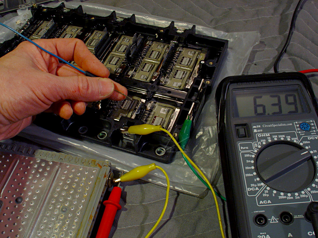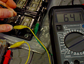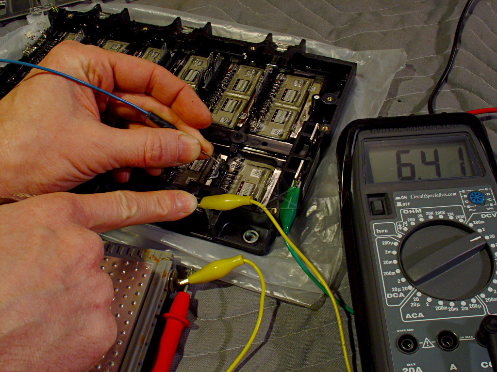 and by removing the pin-probe to the gate, I can cause the voltage to just freeze right where it is. It just holds there -- doesn't drift up or down for a very long time, until the charge is given a path to dissipate by touching the gate again. Just like a FET should, of course, and the leakage exhibited here is small to nonexistent. Forward voltages appear to be fairly normal -- diodes and saturated transistors at 0.6V when non-trivial currents [~120 mA] are passed through them. The forward voltage of the entire rack's worth of diodes, taken at the supply inputs, reads 0.95 under the same conditions. You can guess what would happen if this were hooked up to the 200V battery as ORNL had it labeled! Playing with higher voltages and currents through the rack will wait until some later phase of testing. The devices in the boost switch are similar, although its diodes appear to have a lower forward voltage of 0.5. Obviously, the lower the better.