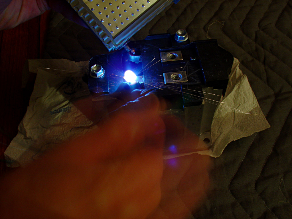 Boost coilThere's not much to the boost inductor. Well, except its ability to store and release energy! This is a time-shot of quickly brushing past one of its terminals with a lead from a battery [a Prius module, appropriately enough] whose other terminal is held on the other coil terminal, and the high-voltage "pow" and bits of flying molten metal from that single pulse are pretty impressive. Now, consider that those IGBTs inside the boost switch do this 12,000 times per second and usefully capture all the results! [That figure is real, from watching the CPWM converter-drive lead from the car's ECU.]