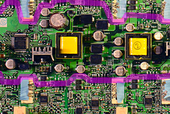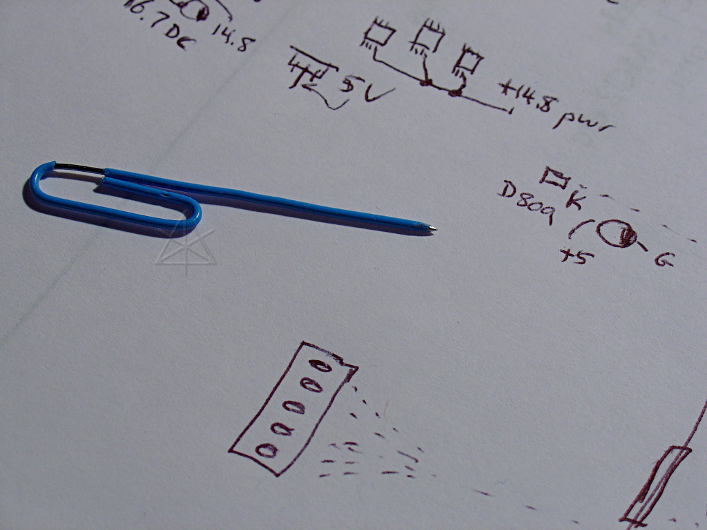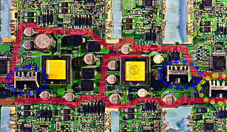 A little bit of 12V conditioning happens over at the right, and then the entire middle section [red boundary] consists of two mostly independent power supplies. Upon supplying 12V power to IGCT and GINV, the two yellow transformers begin emitting a soft but audible high-frequency hash typical of switching power supplies, and a whole bunch of voltages appear at the small electrolytic caps scattered around them. The two heatsunk power transistors circled by blue dots are tied to ground at the emitter and exhibit the high- frequency [and somewhat jittery] transformer-drive waveform, and the ones circled with yellow dots seem to be linear regulators for 5V that feeds the two processors and some other stuff. The board draws about 0.7A at 12.5 volts, and 0.8A at 10 -- higher draw with less voltage, typical of a switching power supply. At 7.8 volts it draws about an amp while trying vainly to start up. The 5V fails at 5.7 volts input, indicating fairly low drop-out regulators. After the board has been running for a while, the warmest components on it are the little yellow transformers. And not inordinately so -- once again, high efficiency, minimal wasted power.