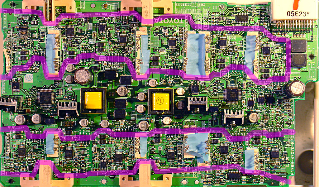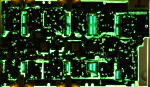 Here's a set of four large images that have been stretched around a little bit, and the rear-view ones flipped right-to-left, such that they very closely match up via-for-via when loaded into one's favorite image editor as layers on top of each other. There's a lot of power-plane in there, so this may or may not help with further circuit-tracing but is kept here for reference. The blue tape over the gate connection slots is simply to keep light from blasting up through them from underneath.
