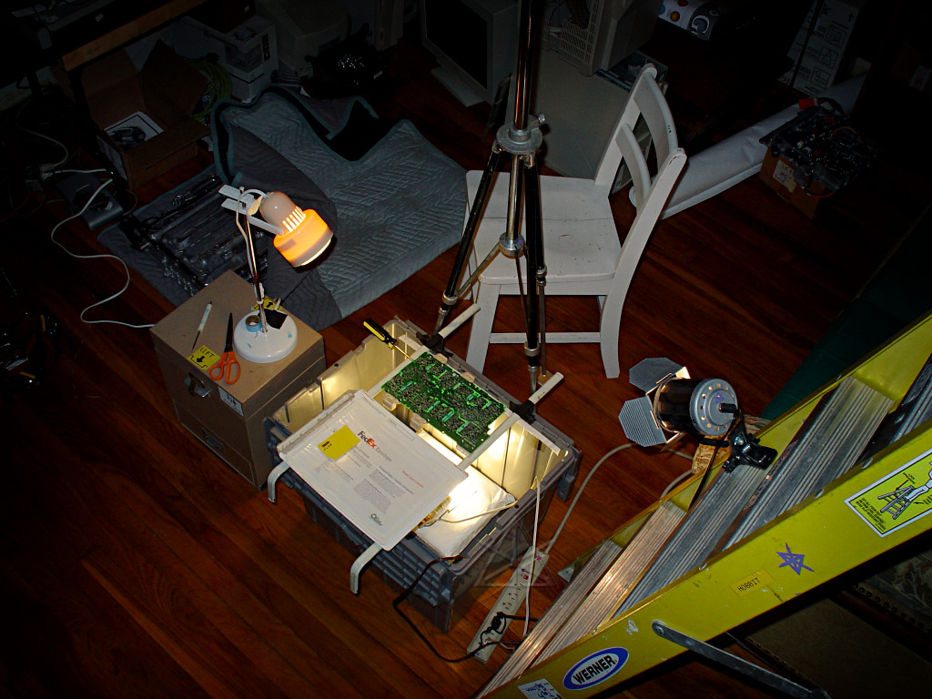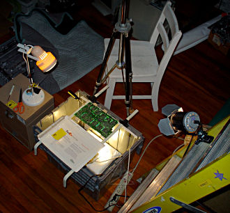 First, we need to get the best possible pictures, not only of both sides of the board but also attempts to probe *inside* a little by shining light through to show where the vias are and even which direction they might roughly head. This was a quick-n-dirty rig to hold the board at the edges and light from above or below and try to keep the camera exactly positioned the same way. It almost worked as intended; a bit of post-correction was definitely necessary.