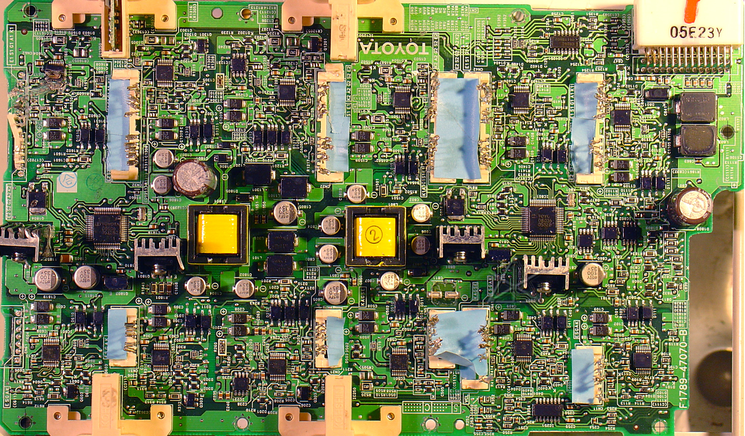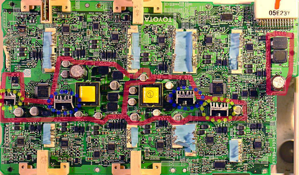 The last thing anyone wants is both elements of a half-bridge to be on at the same time, which would cause a shoot-through short across the supply and rapid loss of the magic smoke that makes things work. Since you can't instantly turn on one element of a half-bridge and turn off the other and guarantee no transition leakage, there has to be some minimal amount of guard time during which both are solidly OFF, usually enforced in hardware. Here, by sending in a single squarewave input and scoping the corresponding pair of gates, I've found that time to be 6 to 8 microseconds. This appears to be done at the processor outputs; it isn't yet clear if there's a backup system to prevent disaster if the processor should ever wig out and turn on both outputs at once. Given the amount of circuitry around the gates, I would expect an additional level of protection in there someplace -- but that would mean more signals needing to cross the isolation boundaries. Maybe that's part of the feedback path -- remains to be seen. For all its sophistication and apparent complexity, this device is still wholly a slave to the hybrid ECU. It does exactly what it's told via the gates and switching-control lead triples, and only sends a little running data back. It has no sense of 3-phase sequencing and cannot intelligently drive the motors for propulsion by itself. From here, I can try to find some part numbers to help further determine functionality, compare against what other analyses have already found, and start getting into what someone would need to know about switching strategy to usefully control this mess. And I still haven't even touched the cooked DC/DC to try and figure out what the heck happened to it yet.