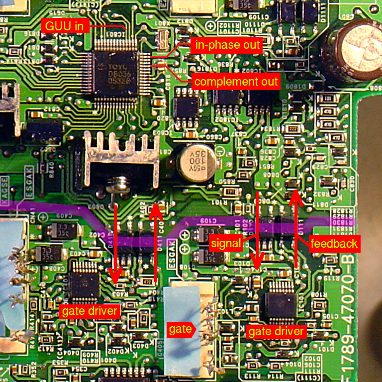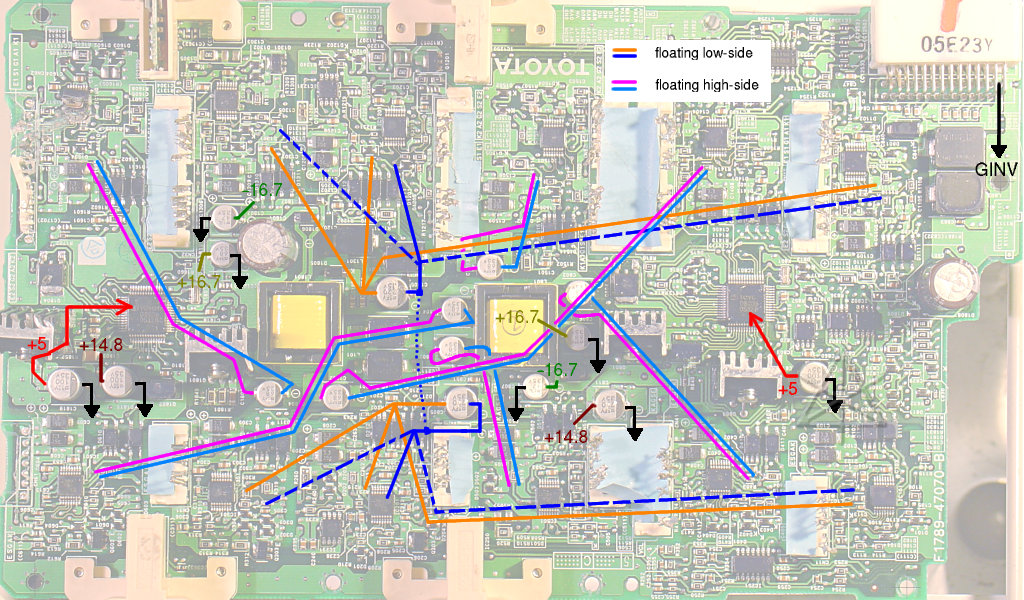 With that in mind, a couple of hours of probing around with a scope and meter in "diode check" mode to find where things are hard-connected together has pretty much ferreted out where all the power goes. It is soon apparent that split (+) and (-) supplies are utilized -- they feed several analog components including the current sensors. Those are interesting -- they appear to have two exactly duplicate outputs, which get routed back to the interface connector as signals like "MIVA" and "MIVB" which scope out as exact clones of each other in the running car. Why two?? Not only that, but they swing above AND BELOW ground, right into the hybrid ECU. That means the hybrid ECU must have some negative-supply stuff inside it too. Why not an easy single-supply swing about 2.5V, like the main battery current sensor? A bit of a mystery there. The really fascinating thing is how the gate driver supplies are done. Each power supply section produces four separate 9.5V or so floating outputs, one slightly more heavy-duty [well, at least with a larger filter cap] than the other three. The large one [where "large" simply refers to its capacitor] feeds all the low-side transistor drivers. The three smaller ones each independently feed the three high-side driver sections for MG1 and MG2, which begins to make it clearer how the high-side isolation is done. The answer seems to be six totally separate little supplies. In the assembled module, all the low-side supply negatives are hard-tied to each other, the "E" control leads, and the main (-) supply from the battery. But there's something a little funky about them -- without the transistor rack in place, the negatives [blue] of the low-side driver supplies aren't tied to each other [lightly dotted line] and are only hard-connected to the driver circuitry in the "V" areas. It isn't clear how the negative supply for "U" and "W" gets there but there's some other component in the way. But the three positives per side are definitely tied together as shown. Again, once this is all soldered down to the rack, it's largely irrelevant and all rides wherever the negative of the 200V battery sends it. I can also see that there's an extra optoisolator device from the "V" low-side back into the nonisolated area, which is undoubtedly related somehow to why it's got the "real negative".