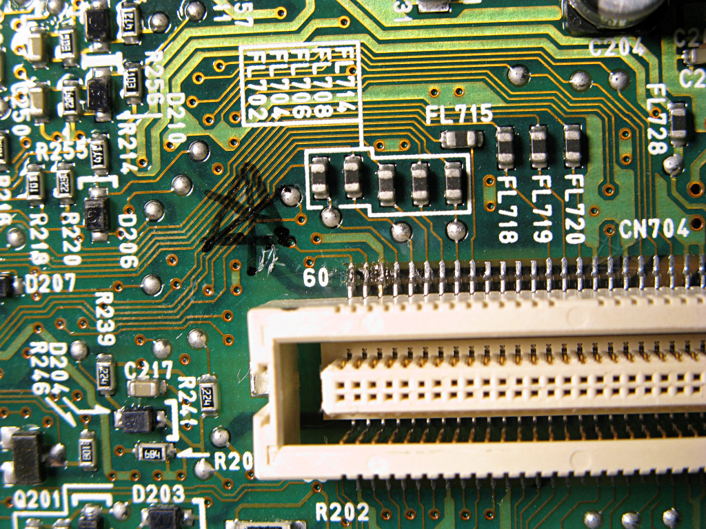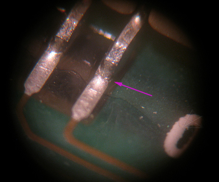 In this particular unit, we once again have what's become the textbook solder joint crack. Time to fire up the tiny-pointed iron and reflow it. |