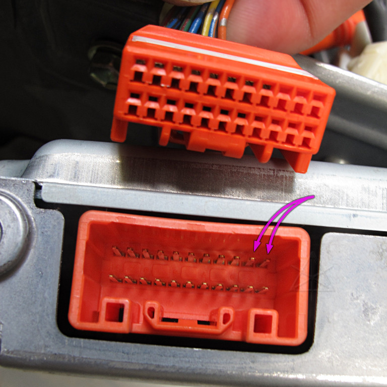 With the ECU removed and its cover popped off, the pins into the monitor board can be inspected. No hint of anything going on here either, around pin 22 or any of the others. |