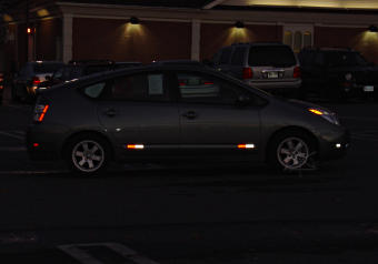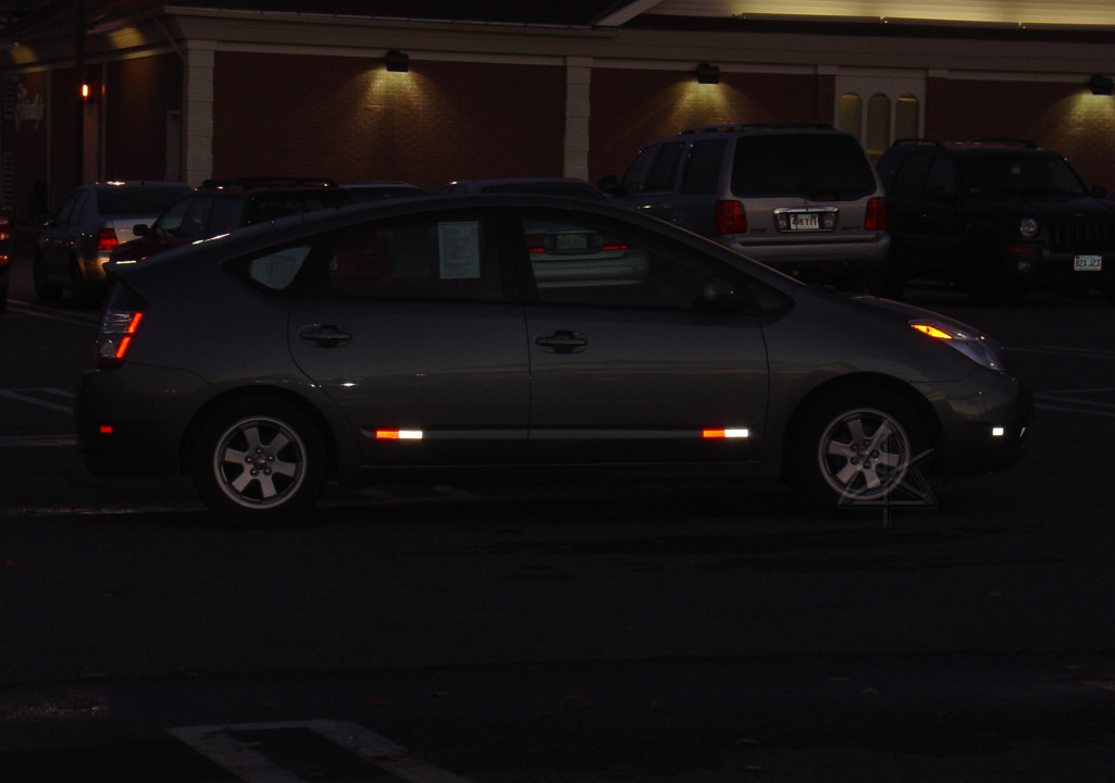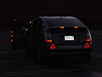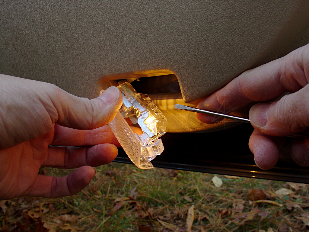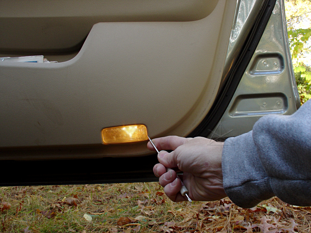 Removing the Prius door-edge lightsa.k.a. our 12 volt battery doesn't need quite this much courtesy[Most images are linked to larger versions.] A problem that frequently surfaces in the forums is when someone leaves a door ajar in a Prius and comes back some time later to find the 12 volt battery totally discharged and unable to boot up the car. The usual cause is from various interior lights staying on because a door is not fully closed. While it is possible to switch off the front and rear dome lights and the one in the hatch so they don't go on when doors open, there are two more "courtesy lights" in the lower edge of the front doors that are easy to miss noticing and ironically enough, can't easily be disabled by switches. (Really, all the interior lights should be on some kind of timer circuit...) Since the 12V battery used in the Prius is a smaller capacity because it doesn't do the engine-cranking, it can become discharged sooner than other cars' units. However, it's easy to remove the offending light bulbs and disable the courtesy lights too. This shows how easy it is, even for those not very mechanically inclined. All you need is a small screwdriver or similar tool. After doing this, you can leave the doors open as long as you like and the long-term drain on the battery is no more than with the doors closed. While you should be careful to fully close the doors when leaving the car unattended, this will prevent the common case where a door that mistakenly got closed only to the "first click" and is still ajar won't flatten the battery after sitting for just a day or two. Most 12V batteries never quite recover from a complete discharge, and have diminished chemical capacity from then on. | |