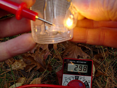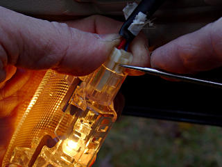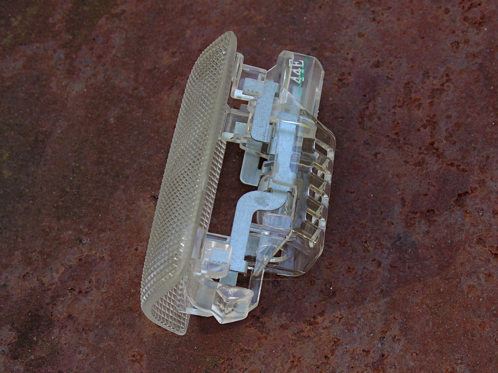 [ The reflective-tape game has since undergone a serious upgrade, which see. ] But it might eventually be nice to have the best of both worlds. Drop-in LED based replacements for the lamps may be available or planned, which would greatly reduce the current drain for the courtesy lights. Ideally, such units could even have self-contained timers so they turn themselves off after a few minutes. | |