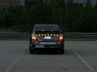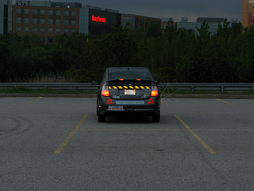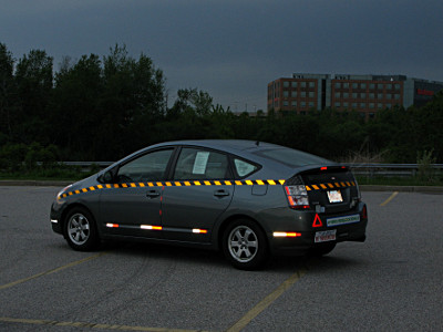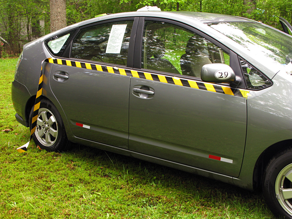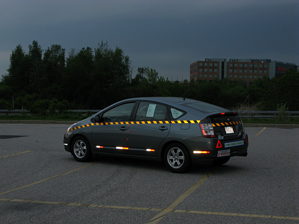 It wasn't enough. With the ever-increasing neanderthal stupidity on the roads these days and so many people completely not paying attention to their driving, it was becoming clear that the "conspicuity effort" needed another step up. While idly browsing around various safety-product sites an idea began forming, and to help visualize some aesthetics a quick-n-dirty "artist's conception" photochop was done based on an old picture from the "naked Prius" page.