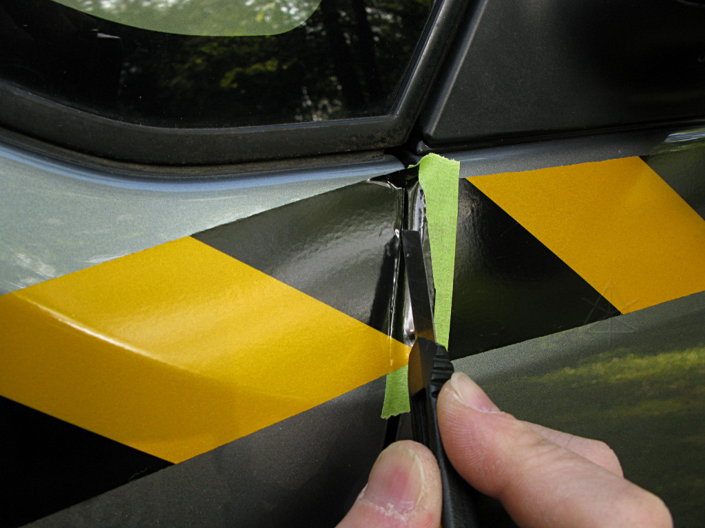 Edges were cut along the tape masks, letting the masking tape cushion the knife point away from the body paint. |