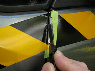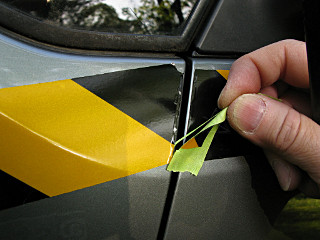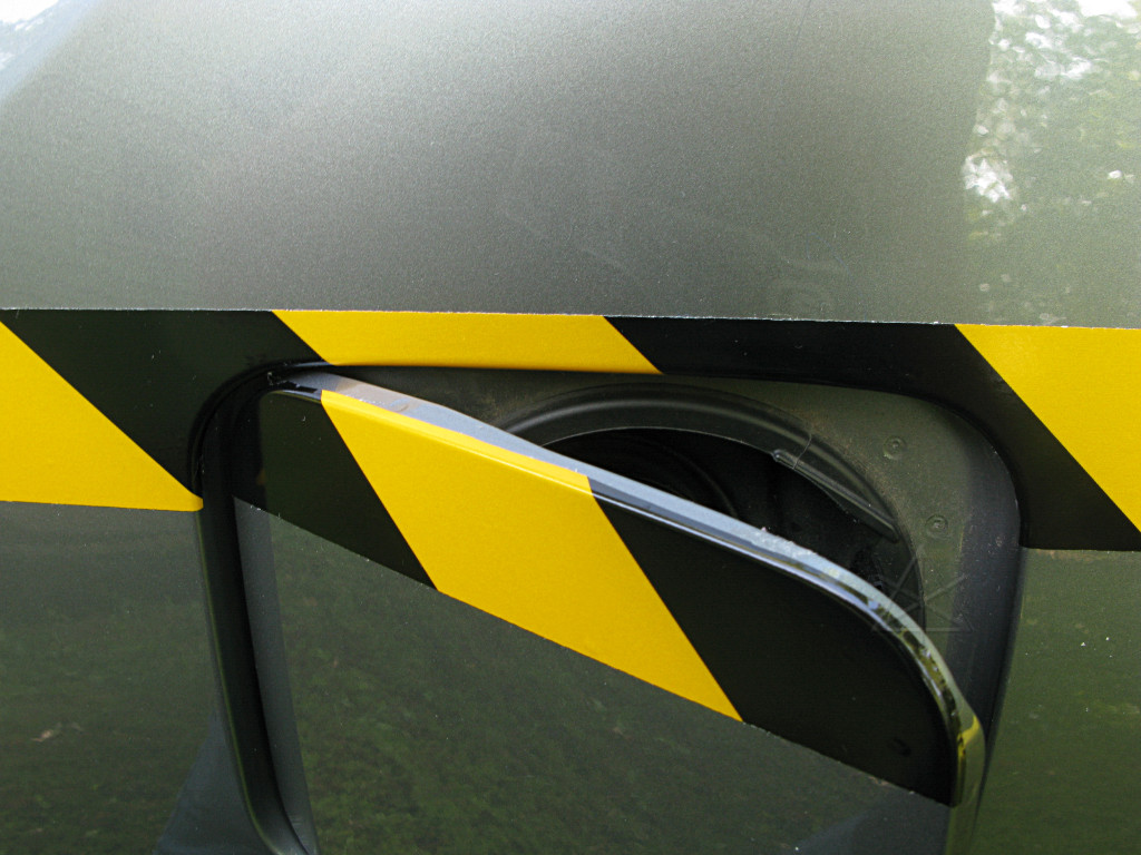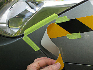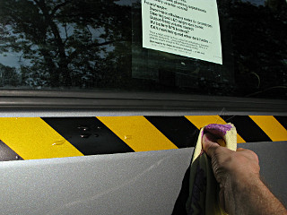 This isn't a real photo and the faked-in stripe is a bit too wide, but it was clear that two-inch retroreflective "bumblebee tape" would fit perfectly along the flat body crease just under the windows. I had to consider this carefully, as it would likely be a permament change. The better "engineer grade" embedded-glass-bead variety of this stuff is very difficult to remove, and would probably take a lot of paint with it if attempted. But I liked the look already, and went ahead to find a local supplier for National Marker's RHS2BY striped tape. The good stuff ain't cheap -- over a buck a foot, and I'd wind up needing about 28 feet of it all told. Conveniently, it comes in 30-foot rolls. |