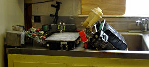 So the first thing to do, of course, is *wash* everything and wipe the heatsink goop off it, and try to hose all the remaining antifreeze out of the coolant passages. Hey, there's an inverter in my sink! Is this high-tech redneck, or what? But heck, this modern day equivalent is way better than the ol' transmission in the bathtub, especially since most people would not yet even begin to recognize this as being car parts.
