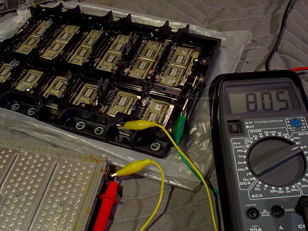 and by removing the pin-probe to the gate, I can cause the voltage to just freeze right where it is. It just holds there -- doesn't drift up or down for a very long time, until the charge is given a path to dissipate by touching the gate again. Just like a FET should, of course, and the leakage exhibited here is small to nonexistent. Forward voltages appear to be fairly normal -- diodes and saturated transistors at 0.6V when non-trivial currents [~120 mA] are passed through them. The forward voltage of the entire rack's worth of diodes, taken at the supply inputs, reads 0.95 under the same conditions. You can guess what would happen if this were hooked up to the 200V battery as ORNL had it labeled! Playing with higher voltages and currents through the rack will wait until some later phase of testing. The devices in the boost switch are similar, although its diodes appear to have a lower forward voltage of 0.5. Obviously, the lower the better.