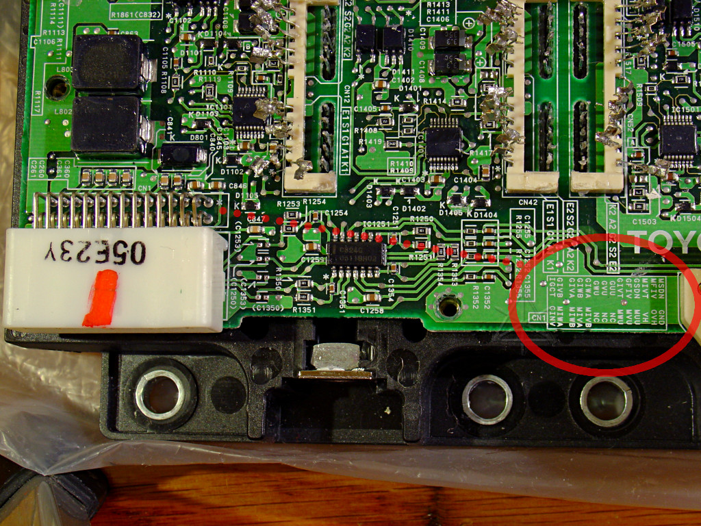 Control boardThe control board has its interface connector nicely documented, albeit at a bit of distance. These connection names are the same as used at the ECU, and described in the "Terminals of ECU" section of the service manual. This is really useful, because it indicates how to hook it up to power and where to find real-life signals in the running car to try and reproduce on the bench.