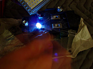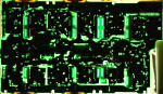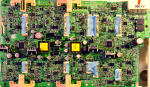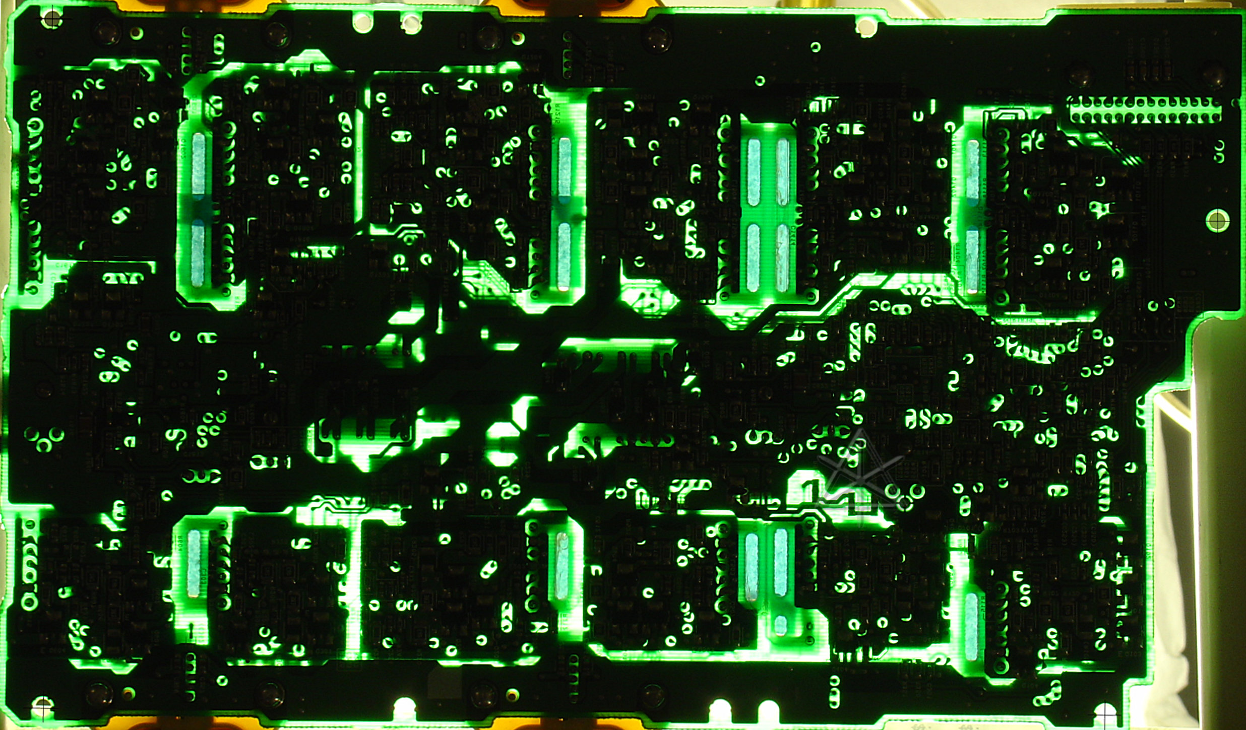 Here's a set of four large images that have been stretched around a little bit, and the rear-view ones flipped right-to-left, such that they very closely match up via-for-via when loaded into one's favorite image editor as layers on top of each other. There's a lot of power-plane in there, so this may or may not help with further circuit-tracing but is kept here for reference. The blue tape over the gate connection slots is simply to keep light from blasting up through them from underneath.