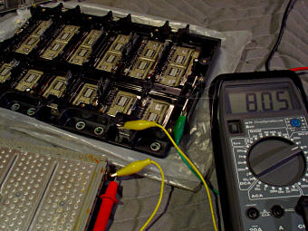 Power transistorsHow about those big power transistors? What are their characteristics? With gates that massive, how much charge does it take to turn them on? Here we won't get a quantitative idea of that, but a little playing around can give some idea. The Prius battery module is hooked up to emitter and collector through a dropping resistor to limit current to about an amp, and we read the voltage across the transistor. With it off, I see full battery voltage. [Which, by the way, is normal real-life for a 6-cell Prius module even though it's rated at 7.2V]