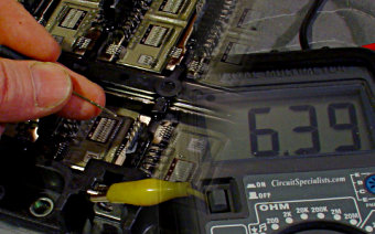 To get through the conformal coating to reach solder lands, a very sharp pin probe is needed. It's easy to make one out of a paper clip; the plastic-coated type provided a little more protection against randomly shorting things if, say, it's dropped onto the board.