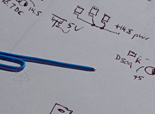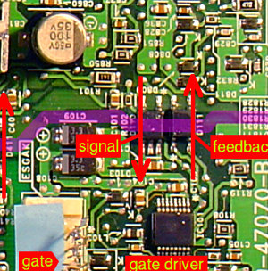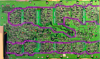 A little bit of 12V conditioning happens over at the right, and then the entire middle section [red boundary] consists of two mostly independent power supplies. Upon supplying 12V power to IGCT and GINV, the two yellow transformers begin emitting a soft but audible high-frequency hash typical of switching power supplies, and a whole bunch of voltages appear at the small electrolytic caps scattered around them. The two heatsunk power transistors circled by blue dots are tied to ground at the emitter and exhibit the high- frequency [and somewhat jittery] transformer-drive waveform, and the ones circled with yellow dots seem to be linear regulators for 5V that feeds the two processors and some other stuff. The board draws about 0.7A at 12.5 volts, and 0.8A at 10 -- higher draw with less voltage, typical of a switching power supply. At 7.8 volts it draws about an amp while trying vainly to start up. The 5V fails at 5.7 volts input, indicating fairly low drop-out regulators. After the board has been running for a while, the warmest components on it are the little yellow transformers. And not inordinately so -- once again, high efficiency, minimal wasted power.