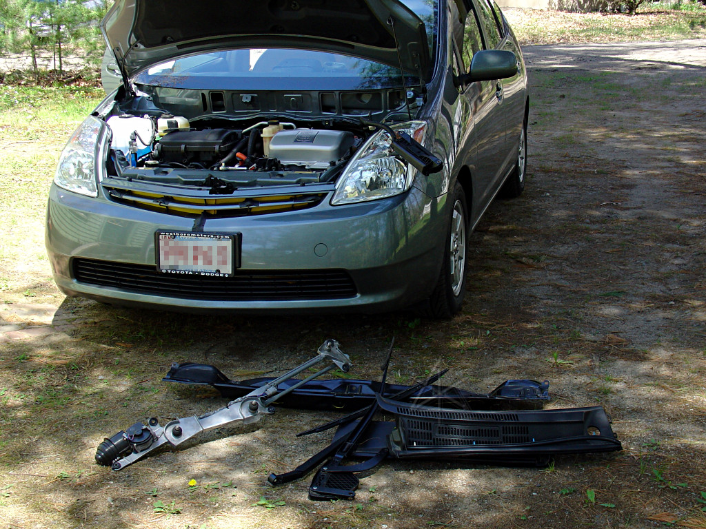 Follow the "heatgames" page instructions to remove the wipers and cowl. Remove the plastic radiator-area cover, whose six clips are easily released with a Phillips driver [but they're *not* actually screws!].