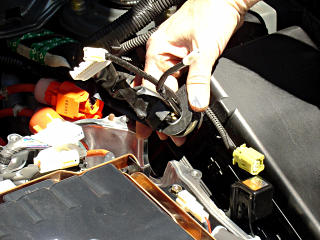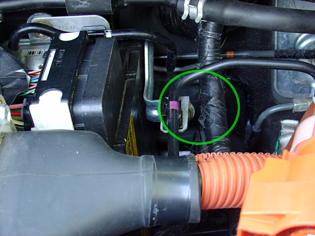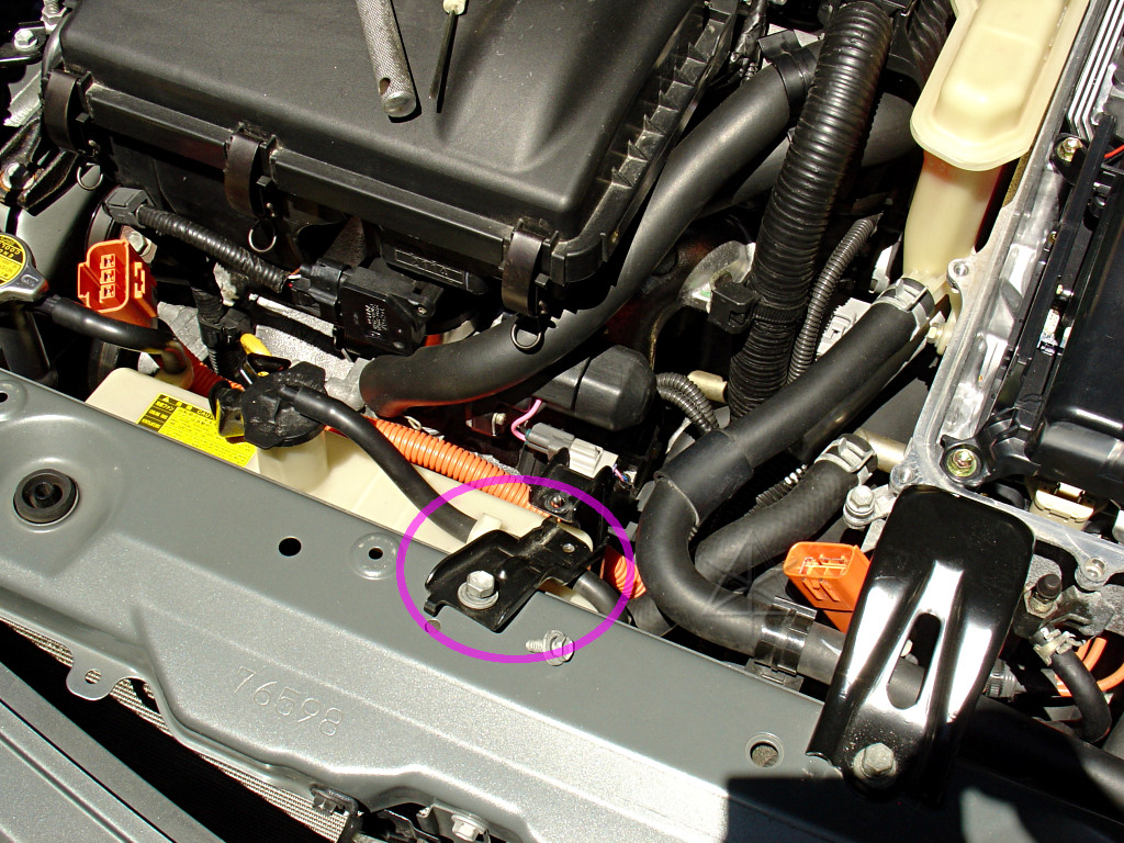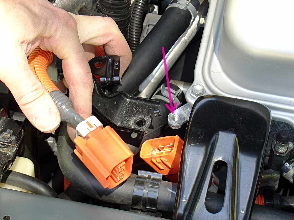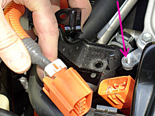 Unplug the A/C connector, and just to make things easier, unbolt the entire bracket from the corner of the inverter [pink] and lay it back along with the wire next to the engine.