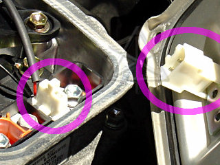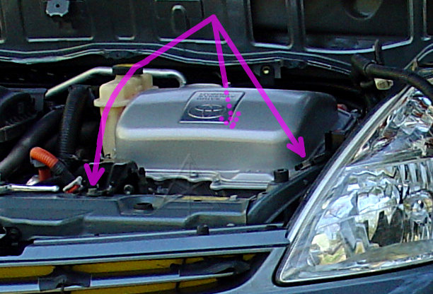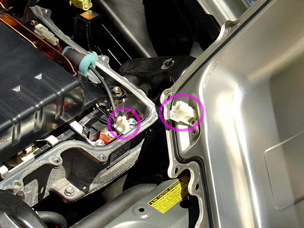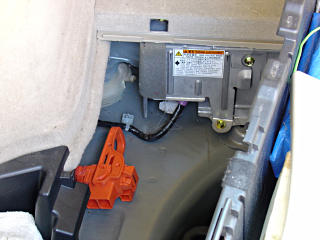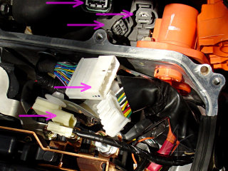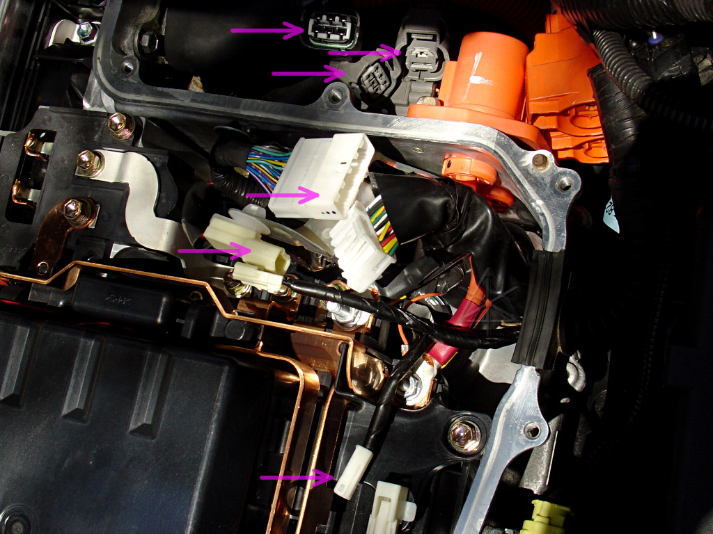 Unhook the three connectors behind, and the three connectors inside the inverter [pink arrows]. The latch on the lowest one in the big picture, with the interlock wire, may need some gentle persuasion with a small screwdriver. The yellow impact-sensor connector on the side is a special airbag-style latch, which pulls back to disengage [easy] and also to reconnect [totally non-intuitive].
