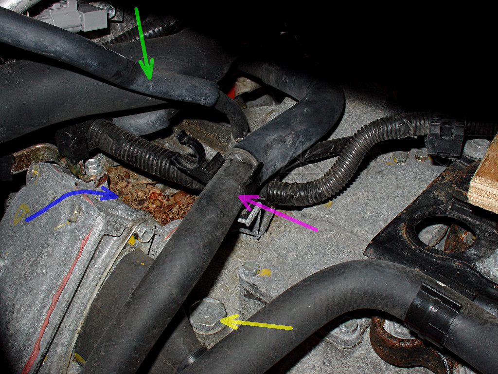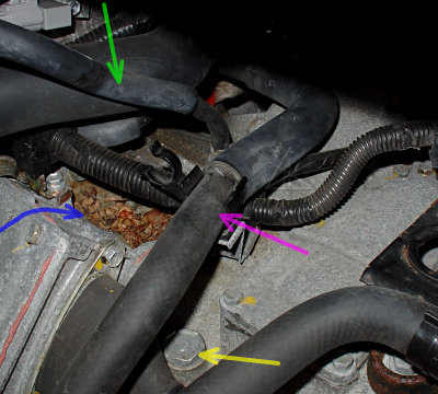 Now we can delve into the dark mysteries underneath. Several things now come to light: the transaxle fill plug [yellow], where the bleed hose [green] hooks up, and an engine coolant hose [pink]. And evidently a little gift from the local rodents [blue], and it's high time *that* was vacuumed out of there too.