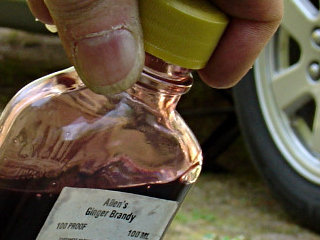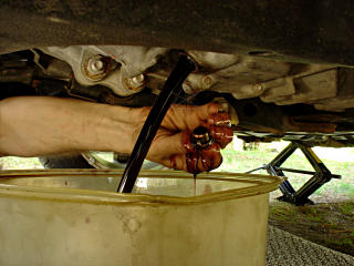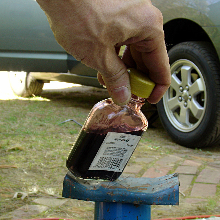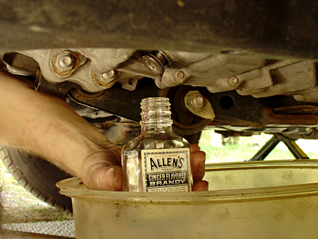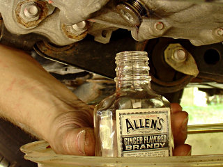 First things first: collect Bob Wilson's fluid sample. This needed to be done directly since I was draining into my usual oil-change pan and didn't want any cross-contamination. How I avoided getting myself soaked with the stuff I can't imagine, but to eliminate the potentially more icky material from the bottom, I drained a little bit, using the plug just barely out of the threads as a vague approximation of a control valve, and then let a thin stream into the sample bottle. The original bottle contents were strictly for medicinal purposes, honest, and more recently it held the acetone supply for the brief and 100% unproductive time that *that* test was in progress. Now it will serve to carry 53K-old transmission fluid in the name of Science.