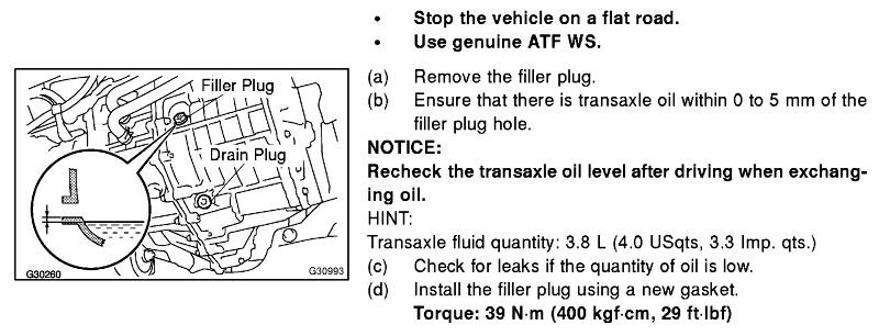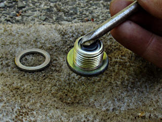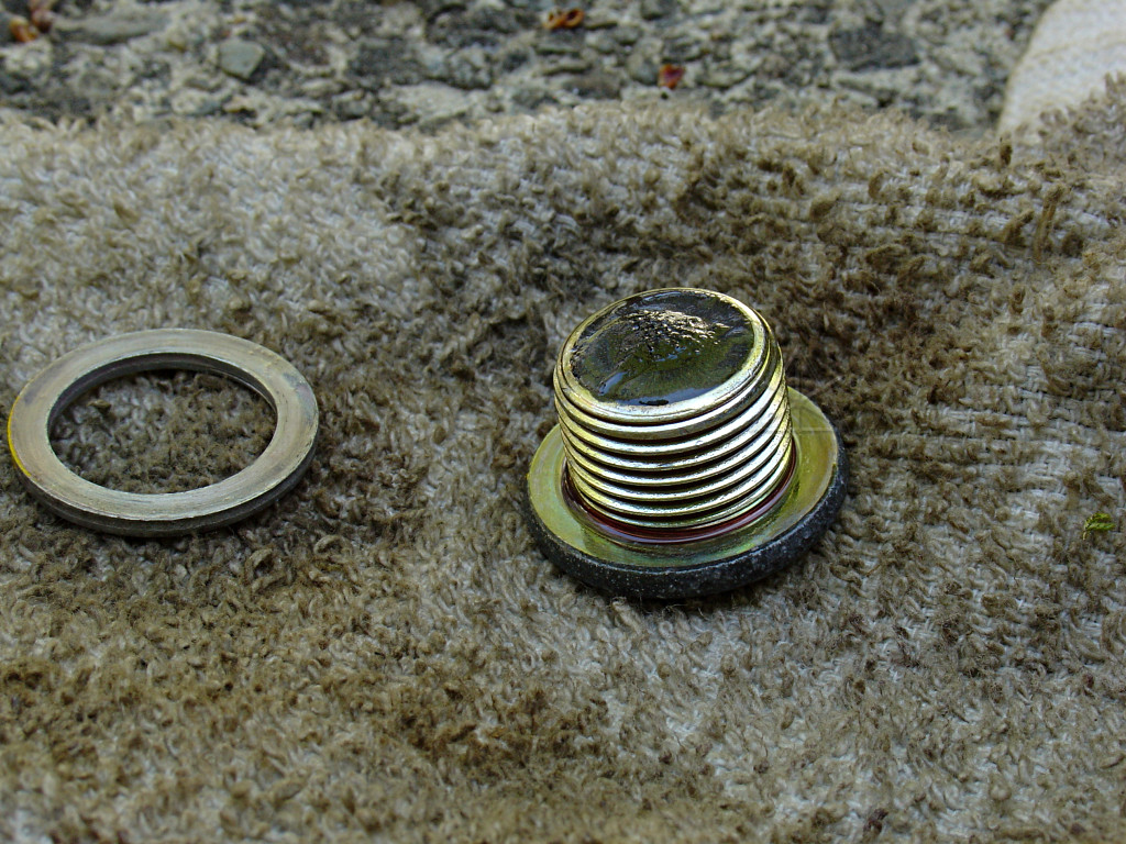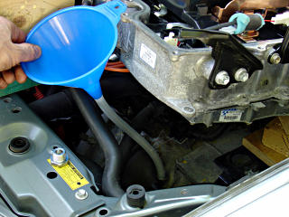 Bombs away! One quart in, check underneath for leaks. Two more quarts in, and finally open up the level-check plug. Spec is 0 - 5 mm below the level of that hole; a little finger inserted and dipped *way* down could just barely find some fluid after three quarts. About a third of a quart later, it was almost to the lip, so I reinstalled the level plug and and added a splash or two more. So 3.3 to 3.5 quarts seems about right for drain-n-refill, where the dry spec is a little over 4. At this point, all remaining transaxle plugs should be reinstalled and tightened. In this case I re-used all the aluminum gaskets, since they're in perfect shape and hopefully I won't have to deal with this for another 50,000 miles.